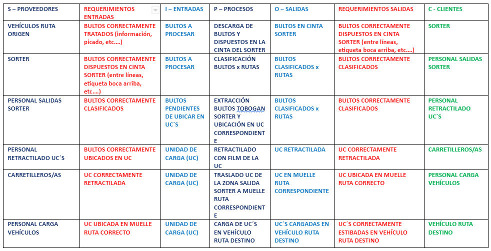 El diagrama de SIPOC (S–Proveedores, I-Entradas, P–Proceso, O–Salidas, C–Clientes), es una herramienta de la metodología LEAN que permite registrar de una manera esquemática la interrelación de los diferentes subprocesos de una operativa, siendo estos pertenecientes a un mismo proceso o siendo compartidos con otros procesos.