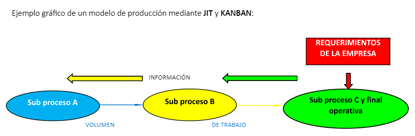 Ejemplo gráfico de un modelo de producción mediante JIT y KANBAN: